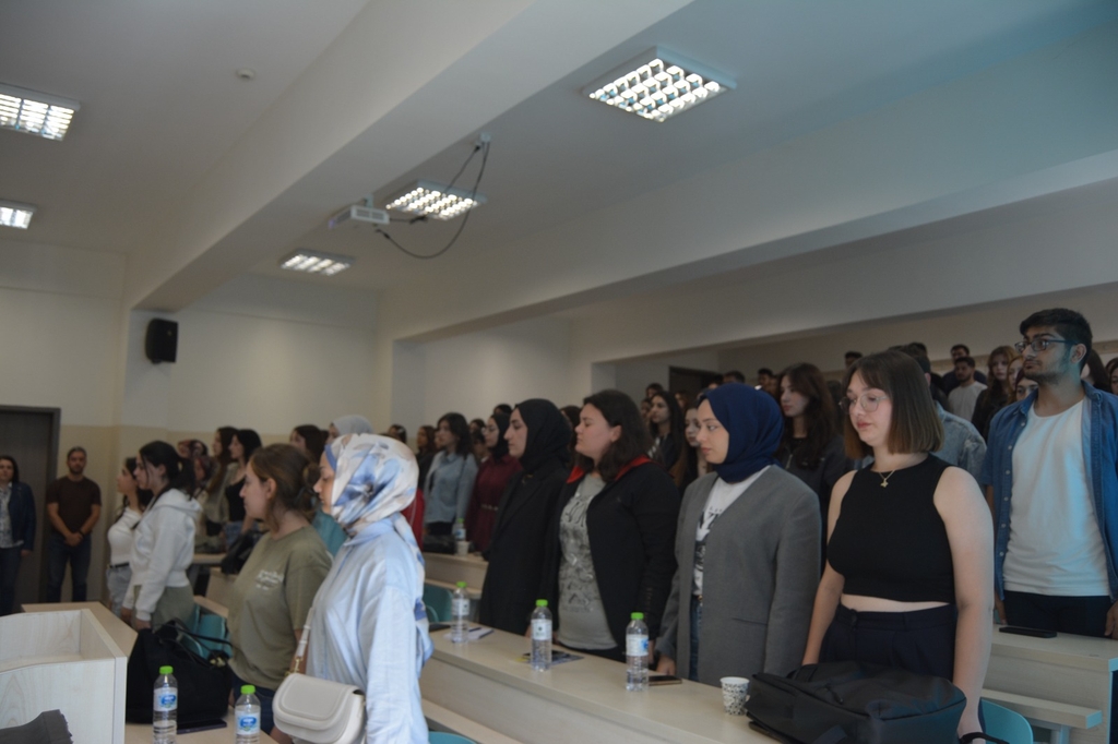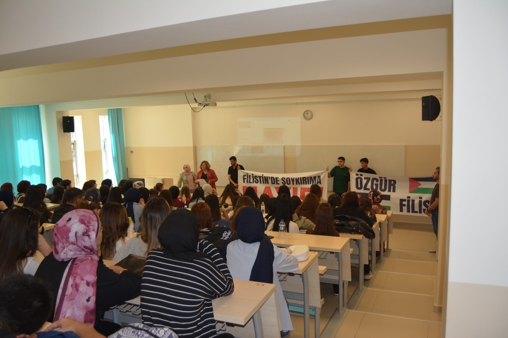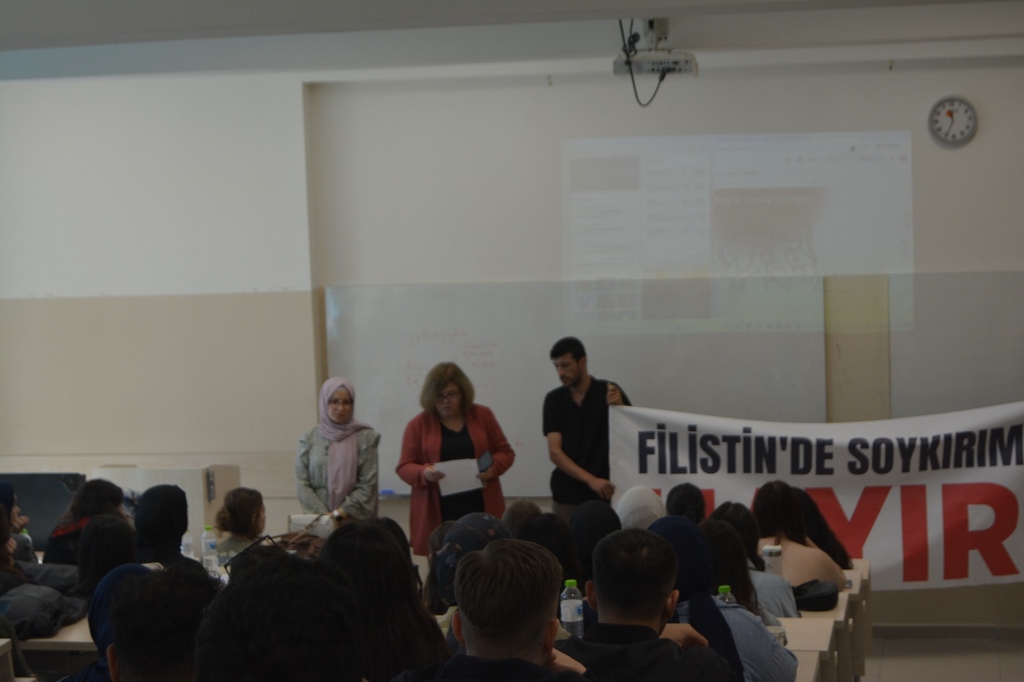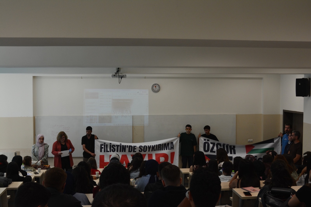 22 Eylül Pazartesi günü, Edebiyat Fakültesinin tüm bölümlerinden öğrencilerin katılımıyla Dr. Öğr. Üyesi Özgür TOKAN Amfisi’nde 2025-2026 Eğitim Yılı Güz Dönemi’nin ilk dersi gerçekleştirilmiş ve Edebiyat Fakültesi Dekan Vekili Prof. Dr. Aslı Yazıcı, Filistin ve Gazze Şeridi’nde yaşanan insanlık trajedisine dikkat çeken, öğrencilerin bu konudaki duyarlılığını artırmaya yönelik bir konuşma yapmıştır.